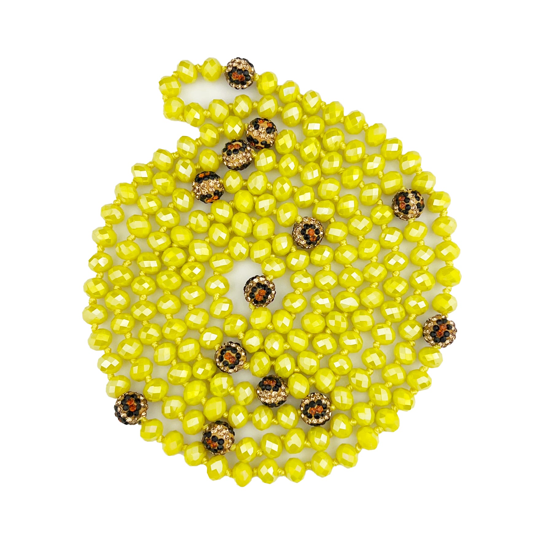 Expertly crafted and designed, our 60" hand-knotted crystal necklace is a stunning addition to any outfit. The necklace features luxurious yellow crystals and a sparkling pave ball 8mm bead. Elevate your look with this beautiful, versatile accessory.